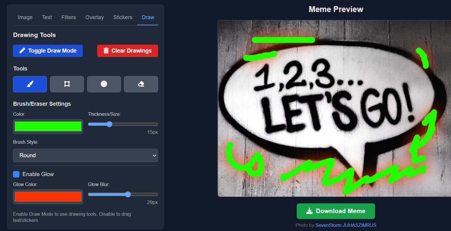 Drawing tools, unleash your inner Picasso or not. Draw directly on the meme, scribble, doodle, write your name in Comic Sans, go wild. Color and thickness control, because a neon pink squiggle is fundamentally different from a chunky black line of pure rage. Shape tools, draw rectangles and circles. Eraser, because mistakes happen or you want to get creative. Glow, your drawings can glow too.